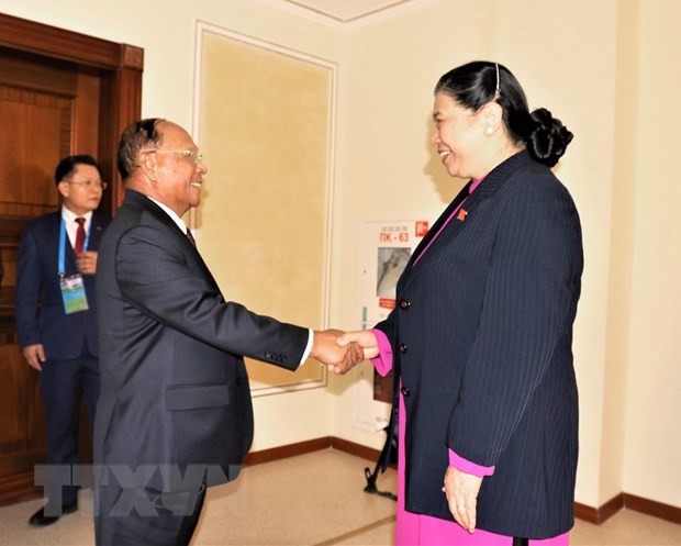 | Phó Chủ tịch Thường trực Quốc hội Tòng Thị Phóng gặp Chủ tịch Quốc hội Campuchia Samdech Heng Samrin. (Ảnh: Dương Trí/TTXVN) |