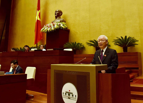 | Tổng Bí thư, Chủ tịch nước Nguyễn Phú Trọng trình bày Tờ trình về việc đề nghị Quốc hội phê chuẩn Hiệp định CPTPP. Ảnh: VGP/Nhật Bắc |