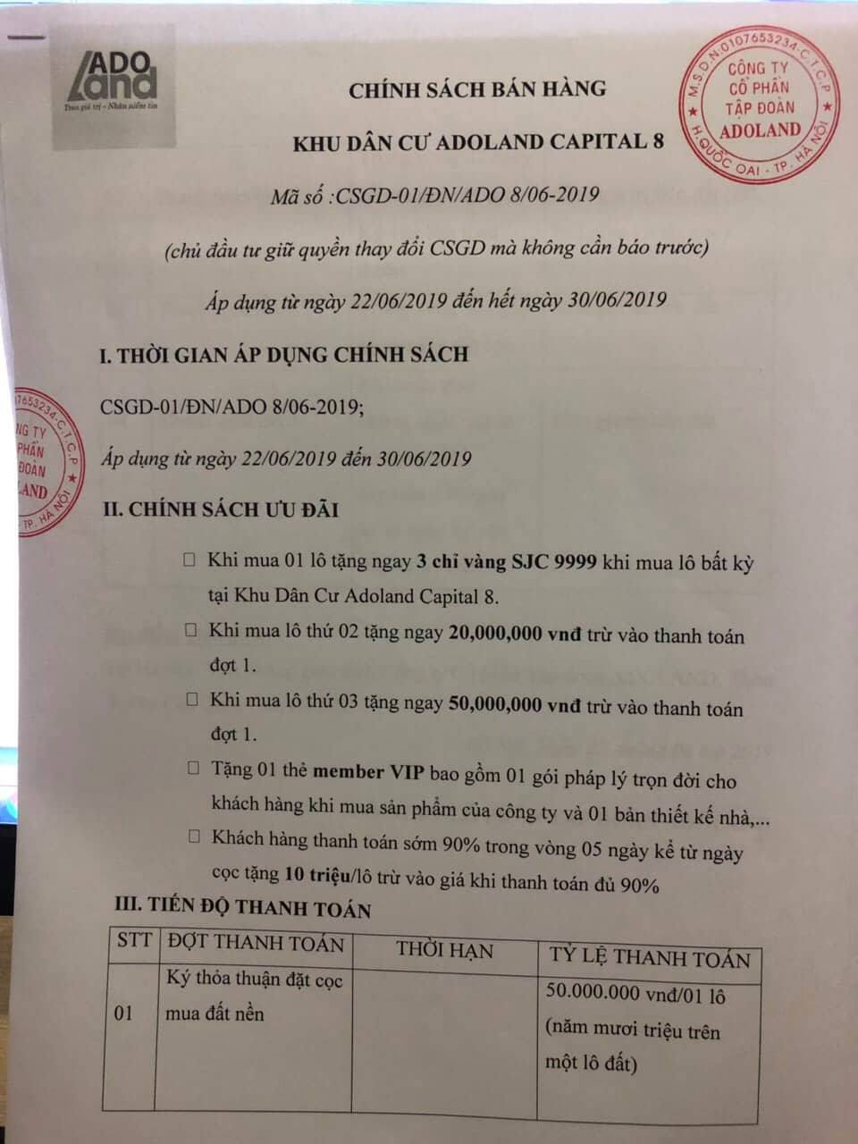 Với danh nghĩa là liên kết, phân phối các lô đất tại đây, Công ty Cổ phần Tập đoàn Adoland đã đưa ra các chính sách bán hàng cũng như những mẫu văn bản giao tiền đặt cọc và văn bản thỏa thuận.