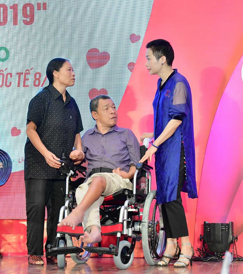 | Bà Trần Hải Anh (Áo xanh, bên phải) - PCT ngân hàng NCB - Chủ tịch quỹ trao tặng xe lăn cho người khuyết tật có hoàn cảnh khó khăn |