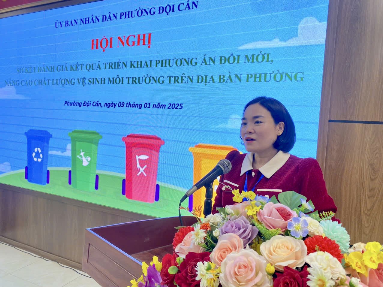 Bà Ngô Thị Minh Hằng - Chủ tịch UBND phường Đội Cấn cho biết: Sau một thời gian thực hiện phương án đổi mới nâng cao chất lượng vệ sinh môi trường kết hợp với công tác tuyên truyền đã nâng cao được nhận thức, ý thức của nhân dân trong công tác thu gom rác thải, đảm bảo vệ sinh môi trường; các tuyến đường phố Đội Cấn, Ngọc Hà, Giang Văn Minh trên địa bàn phường đã trở lên sáng – xanh – sạch đẹp hơn, vệ sinh môi trường được đảm bảo, nâng cao hơn.