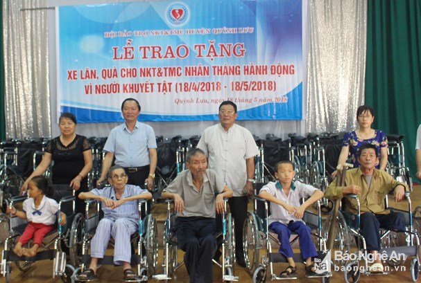 | Lãnh đạo huyện Quỳnh Lưu cùng các ban, ngành, đoàn thể trao tặng xe lăn cho 70 người khuyết tật. |