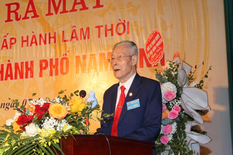 Ông Trần Mạnh Lưu, Chủ tịch Họ Trần Việt Nam tỉnh Nam Định phát biểu chỉ đạo tại lễ ra mắt BCHLT Họ Trần Việt Nam thành phố Nam Định - Ảnh: Hồ Thanh