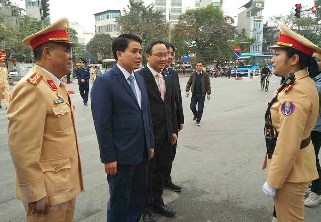 | Chủ tịch Ủy ban Nhân dân thành phố Hà Nội Nguyễn Đức Chung và các đại biểu với lực lượng cảnh sát giao thông Hà Nội làm nhiệm vụ tại phố Cửa Nam-Điện Biên Phủ. (Ảnh: Doãn Tấn/TTXVN) |