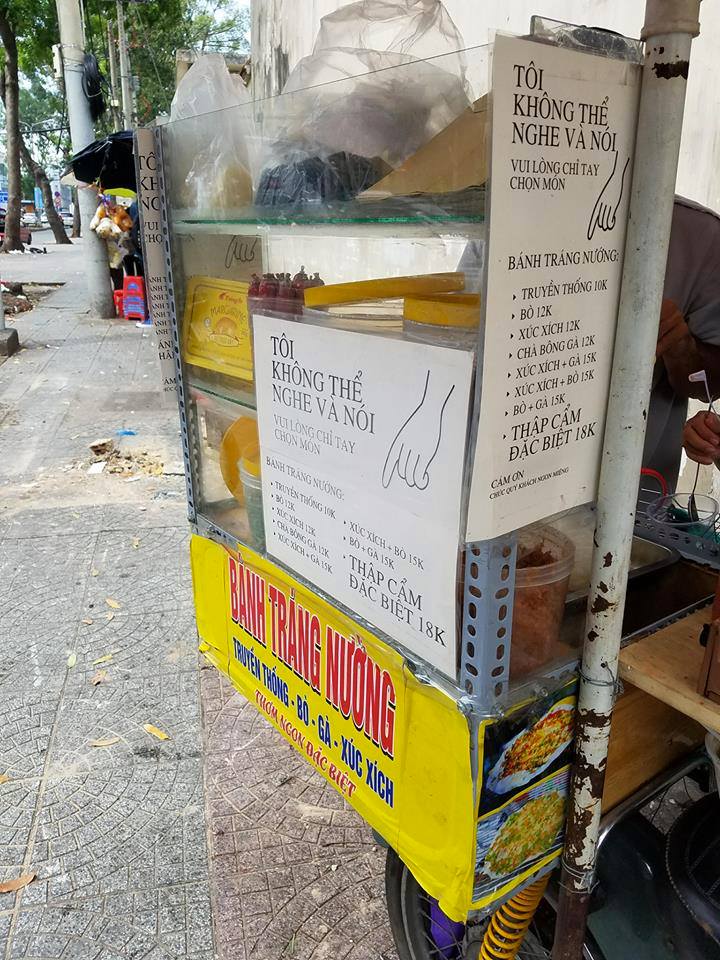 Ngay trước cổng trường Đại học Sài Gòn, có một chiếc xe bán bánh tráng nướng vô cùng dễ thương. Với những thực khách, xe bánh tráng, bảng thực đơn cùng với dòng chữ “Tôi không thể nghe và nói, vui lòng chỉ tay chọn món” dường như là điều thú vị khi ghé tới đây.