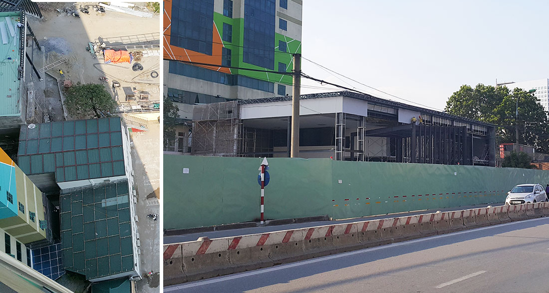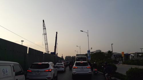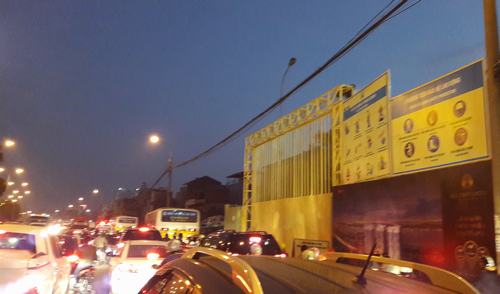 Hàng rào tôn, cổng công trường một dự án đang xây dựng được dựng sát mép đường giao thông, chỉ cần một xe ra vào công trường là gây ách tắc giao thông cục bộ đoạn đường