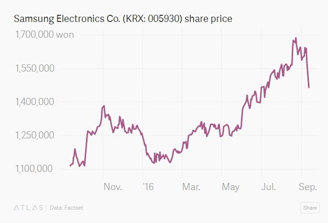Theo Factset, kể từ khi Samsung thông báo sẽ thu hồi Galaxy Note 7, hãng điện tử này đã "bốc hơi" hơn 28.000 tỷ won (tương đương hơn 26 tỷ USD) giá trị vốn hóa.