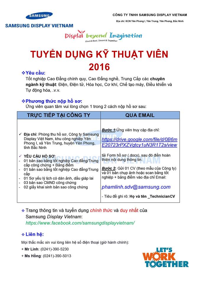 Nhằm đáp ứng nhu cầu mở rộng sản xuất năm 2016, Samsung Display Vietnam liên tục tuyển dụng hàng trăm kỹ thuật viên tốt nghiệp Cao đẳng/Trung cấp tất cả các chuyên ngành kỹ thuật trên cả nước.
