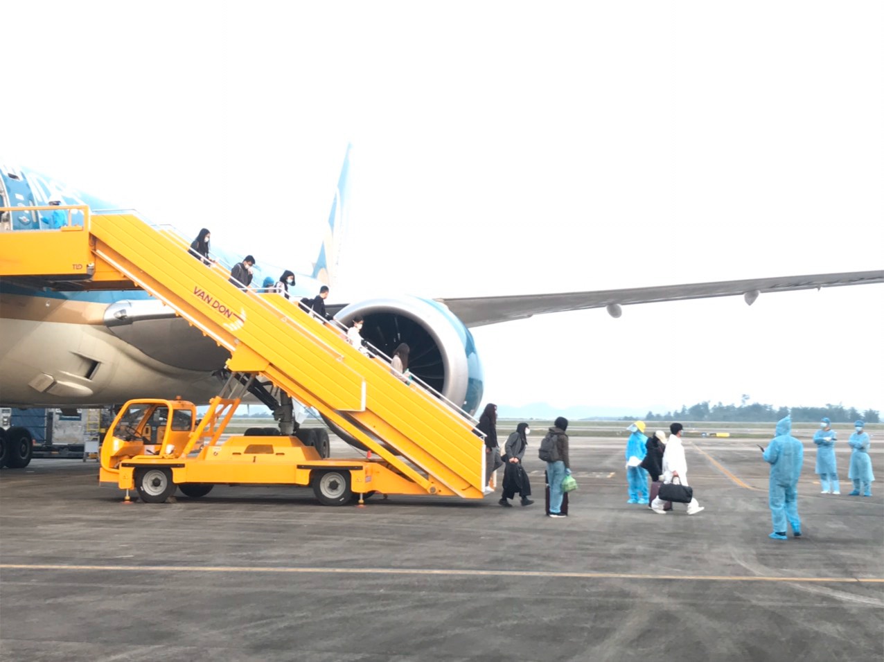 Hành khách trên chuyến bay từ Anh hạ cánh xuống sân bay Vân Đồn.