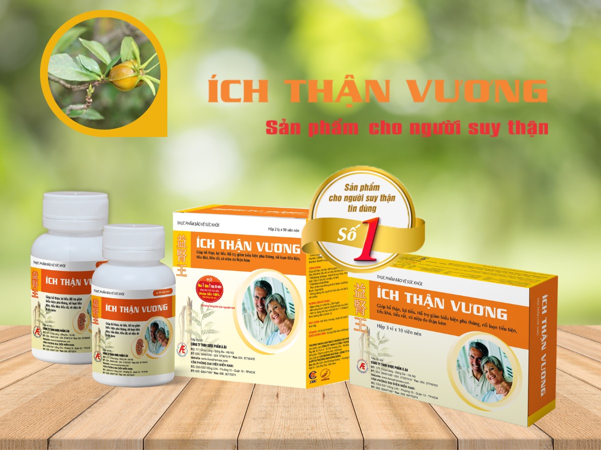 Thực phẩm bảo vệ sức khỏe Ích Thận Vương - Giúp bổ thận, lợi tiểu Ích Thận Vương với thành phần cao đan sâm, cao hoàng kỳ, cao dành dành, trầm hương, bạch phục linh, cao râu mèo, L - carnitine fumarate, cao mã đề, cao linh chi đỏ và coenzyme Q10. Sản phẩm giúp bổ thận, lợi tiểu; Hỗ trợ giảm biểu hiện phù thũng, rối loạn tiểu tiện, tiểu khó, tiểu rắt, vô niệu do thận kém. Thực phẩm bảo vệ sức khỏe Ích Thận Vương dùng cho người bị suy thận, chức năng thận kém biểu hiện: Tiểu ít, tiểu rắt, vô niệu, bí tiểu.