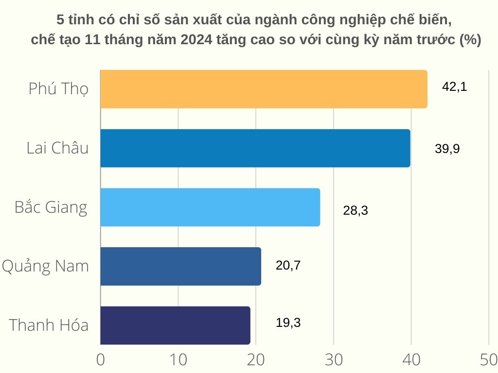 Trong đó, địa phương có chỉ số sản xuất của ngành công nghiệp chế biến, chế tạo 11 tháng năm 2024 so với cùng kỳ năm trước tăng cao: Phú Thọ tăng 42,1%; Lai Châu tăng 39,9%; Bắc Giang tăng 28,3%; Quảng Nam tăng 20,7%; Thanh Hóa tăng 19,3%.