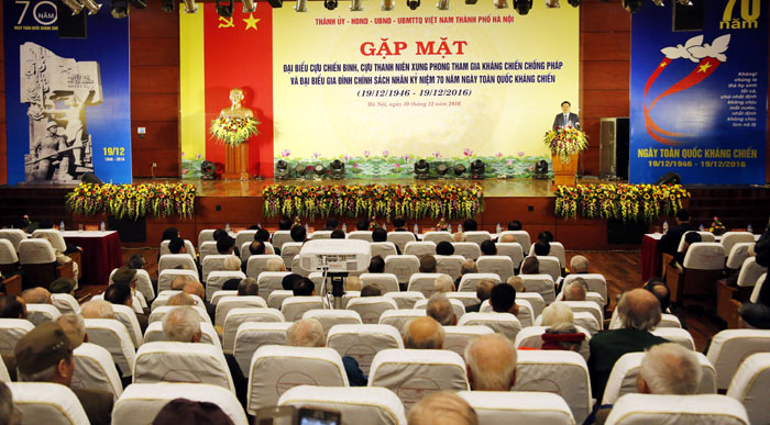 HOANHAP.VN - Sáng 10/12, hướng tới ngày kỷ niệm 70 năm Ngày Toàn quốc kháng chiến (19/12/1946 - 19/12/2016), Thành ủy, HĐND, UBND, Ủy ban MTTQ Việt Nam TP Hà Nội đã tổ chức buổi gặp mặt thân mật với các đồng chí đại biểu cựu chiến binh (CCB), cựu Thanh niên xung phong (TNXP) trực tiếp tham gia kháng chiến chống Pháp và đại diện gia đình chính sách trên địa bàn Thủ đô.