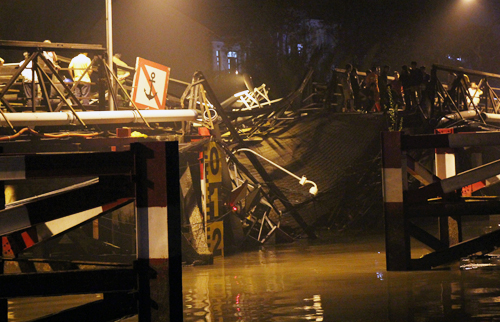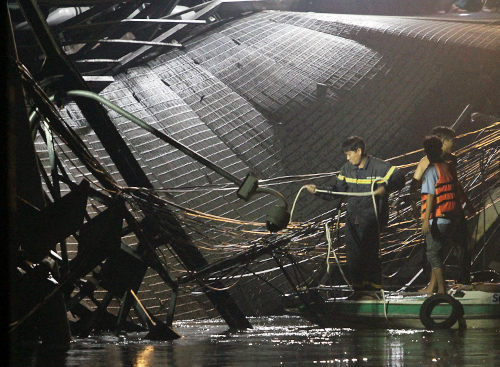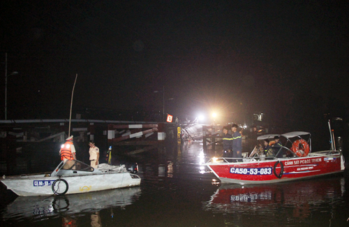 Ca nô của Cảnh sát đường thuỷ liên tục đảo quanh hiện trường, soi đèn khảo sát mặt nước khu vực cầu sập.