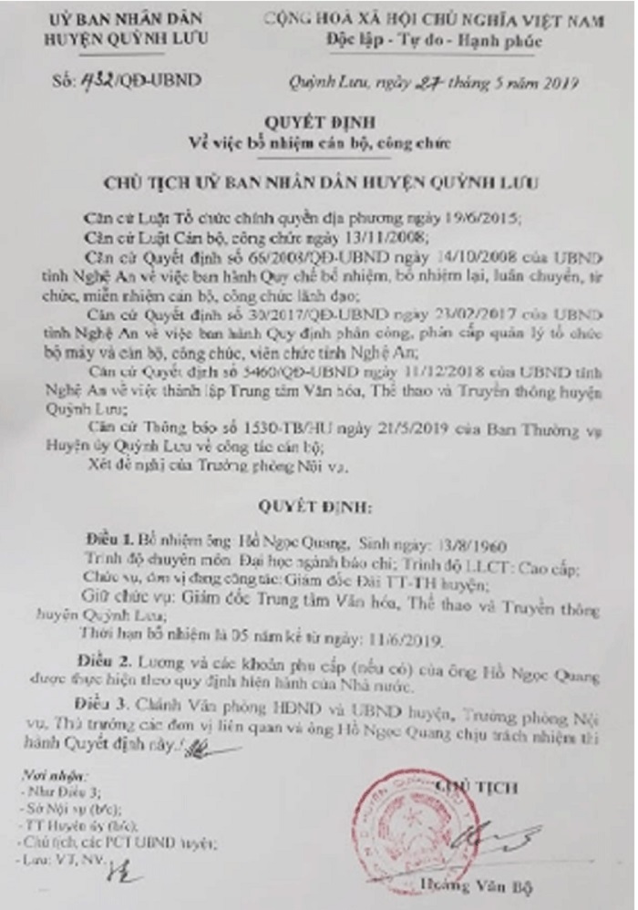 Trong quyết định bổ nhiệm ông Hồ Ngọc Quang làm giám đốc đơn vị hợp nhất này có nêu đầy đủ các căn cứ pháp lý Chủ tịch UBND huyện Quỳnh lưu ký quyết định