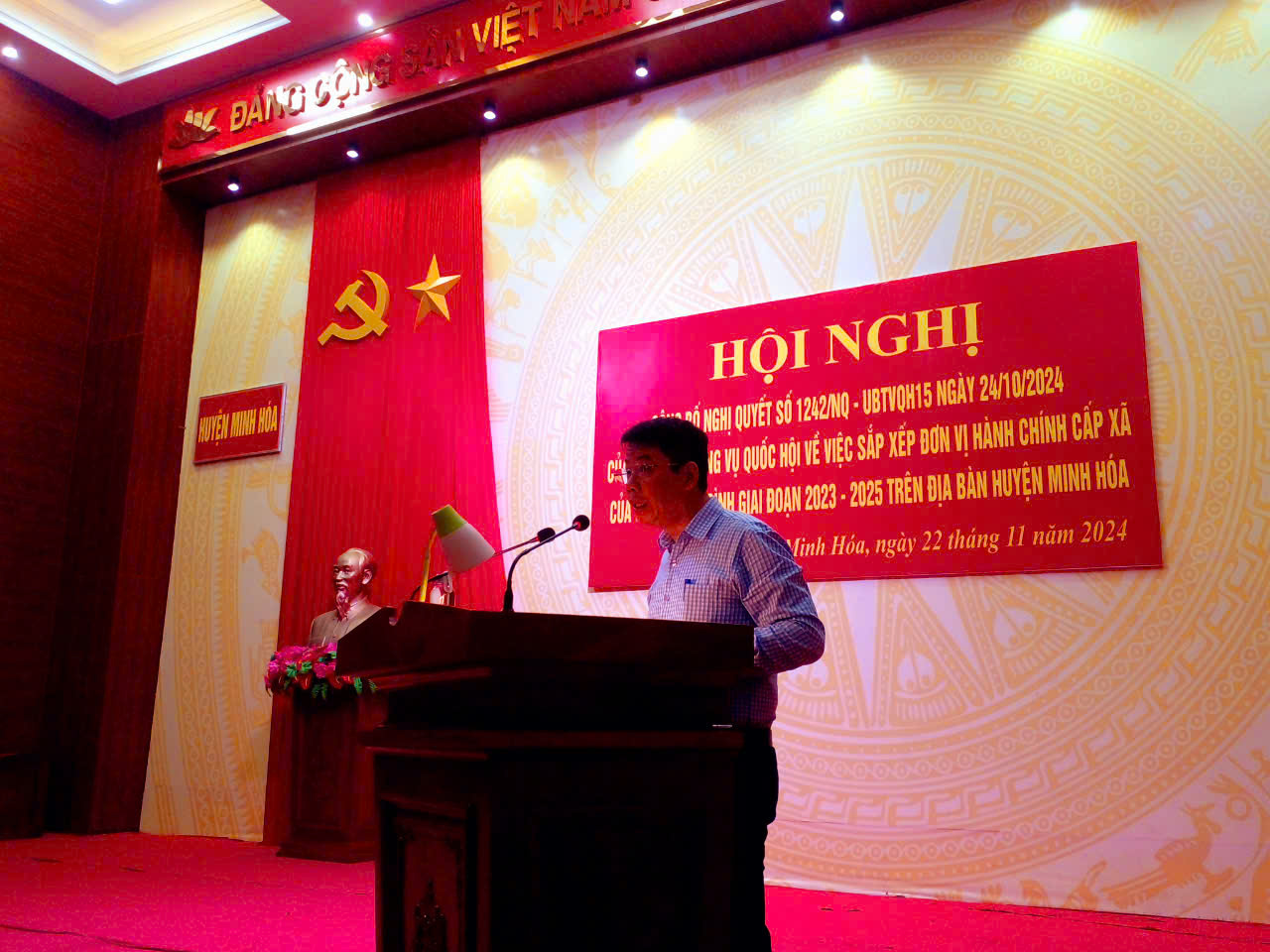 Ông Bùi Anh Tuấn, Bí thư huyện uỷ huyện Minh Hoá, nhấn mạnh về mục đích, ý nghĩa chủ trương lớn của Đảng đối với sắp xếp đơn vị hành chính tại huyện Minh Hoá về cơ bản đã bám sát hướng dẫn của các bộ, ngành Trung ương, của tỉnh Quảng Bình để thực hiện các bước sắp xếp đơn vị hành chính bảo đảm tiến độ. Khẳng định sắp xếp đơn vị hành chính là công việc khó, có yêu cầu cao, tác động lớn đến mọi lĩnh vực của đời sống xã hội, Bí thư huyện uỷ mong muốn cấp ủy, chính quyền và toàn hệ thống chính trị huyện Minh Hoá tiếp tục tập trung lãnh đạo, chỉ đạo để thực hiện bảo đảm tiến độ. Sau khi sắp xếp, huyện Minh Hóa có 13 đơn vị hành chính cấp xã, gồm 12 xã và 1 thị trấn.