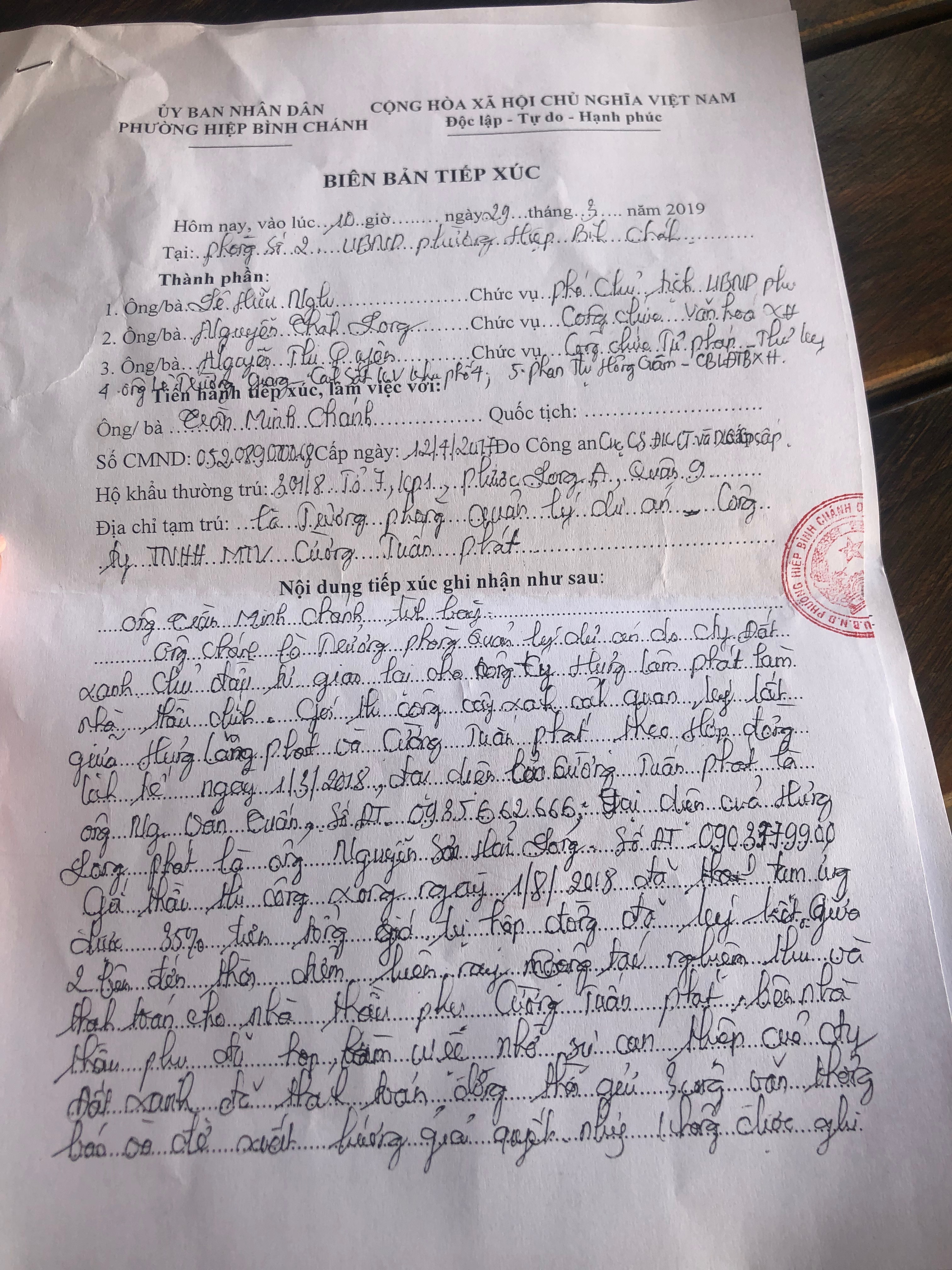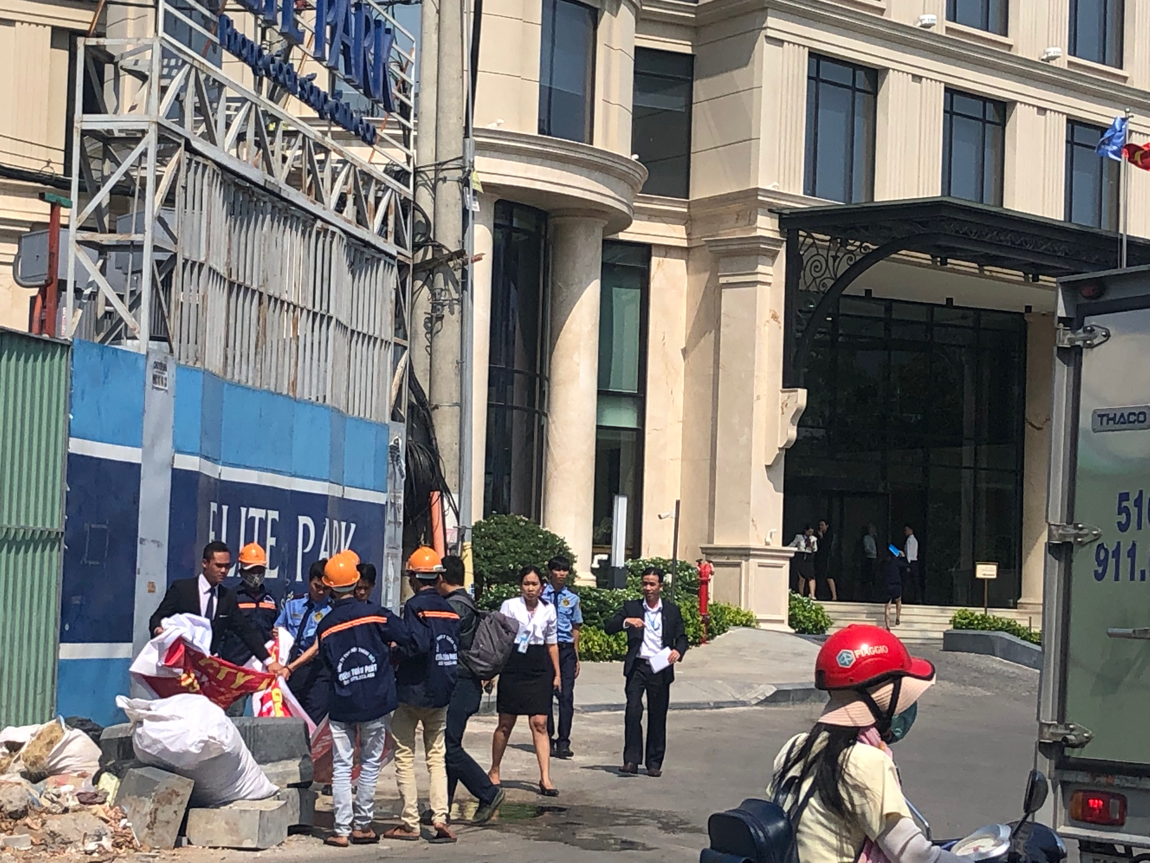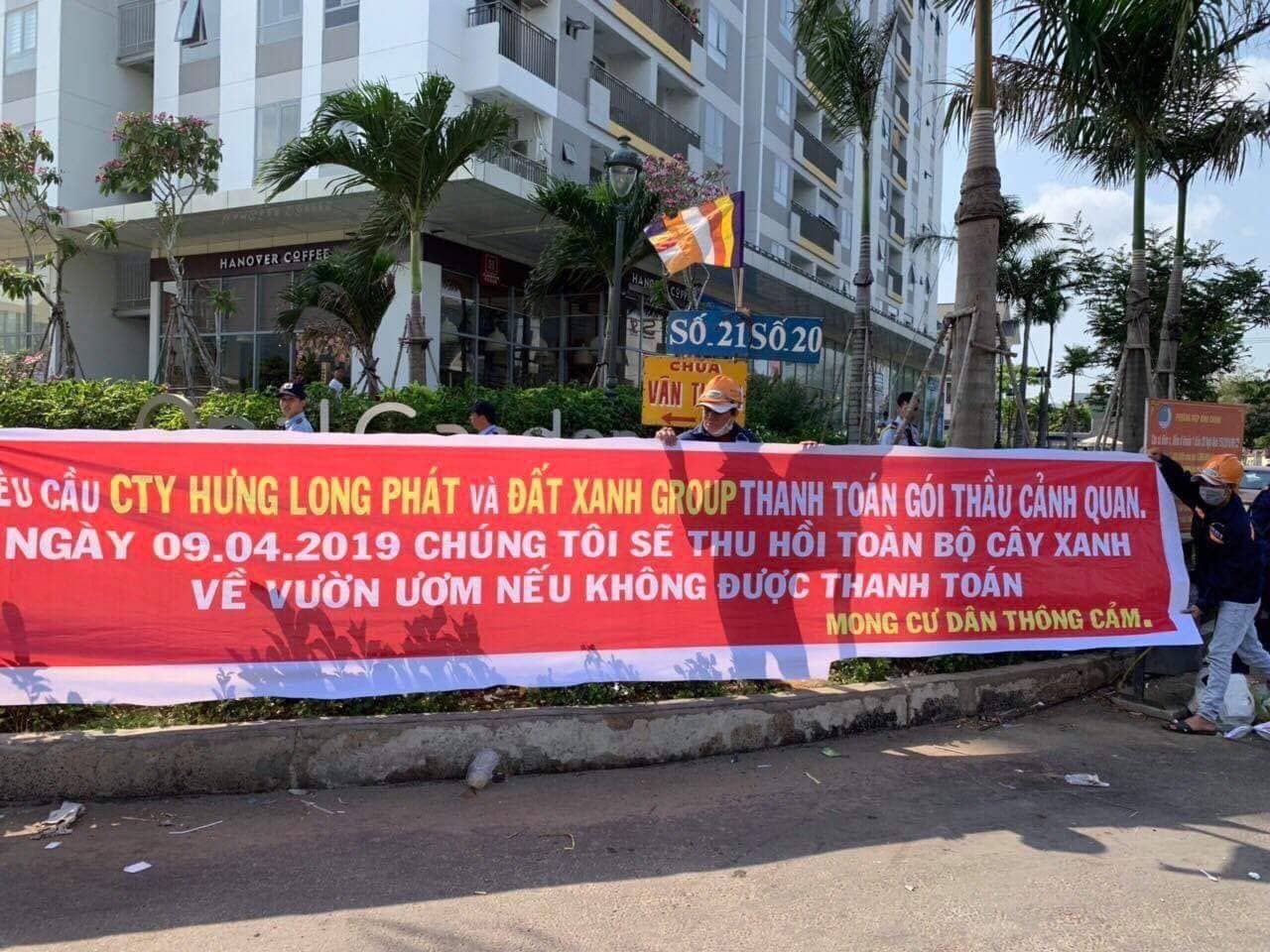 Sự việc chưa dừng lại ở đó, sau khi làm việc xong tại UBND phường Hiệp Bình Chánh, nhóm công nhân của công ty Cường Thuận Phát tiếp tục kéo đến tận trụ sở Tập đoàn Đất Xanh (số 2 Ung Văn Khiêm, quận Bình Thạnh) để căng băng rôn yêu cầu phía Đất Xanh phải ra mặt để làm rõ sự việc.