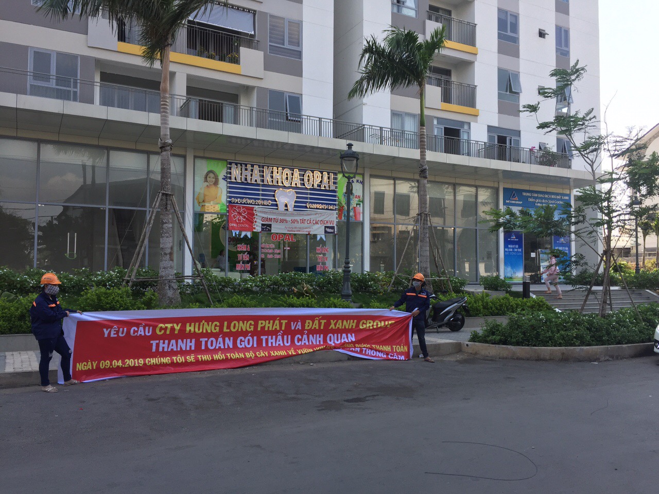 | Một số công nhân của công ty TNHH MTV Cường Thuận Phát đã tập trung để căng băng rôn kêu cứu tại dự án Opal Garden và tại trụ sở Tập đoàn Đất Xanh: |