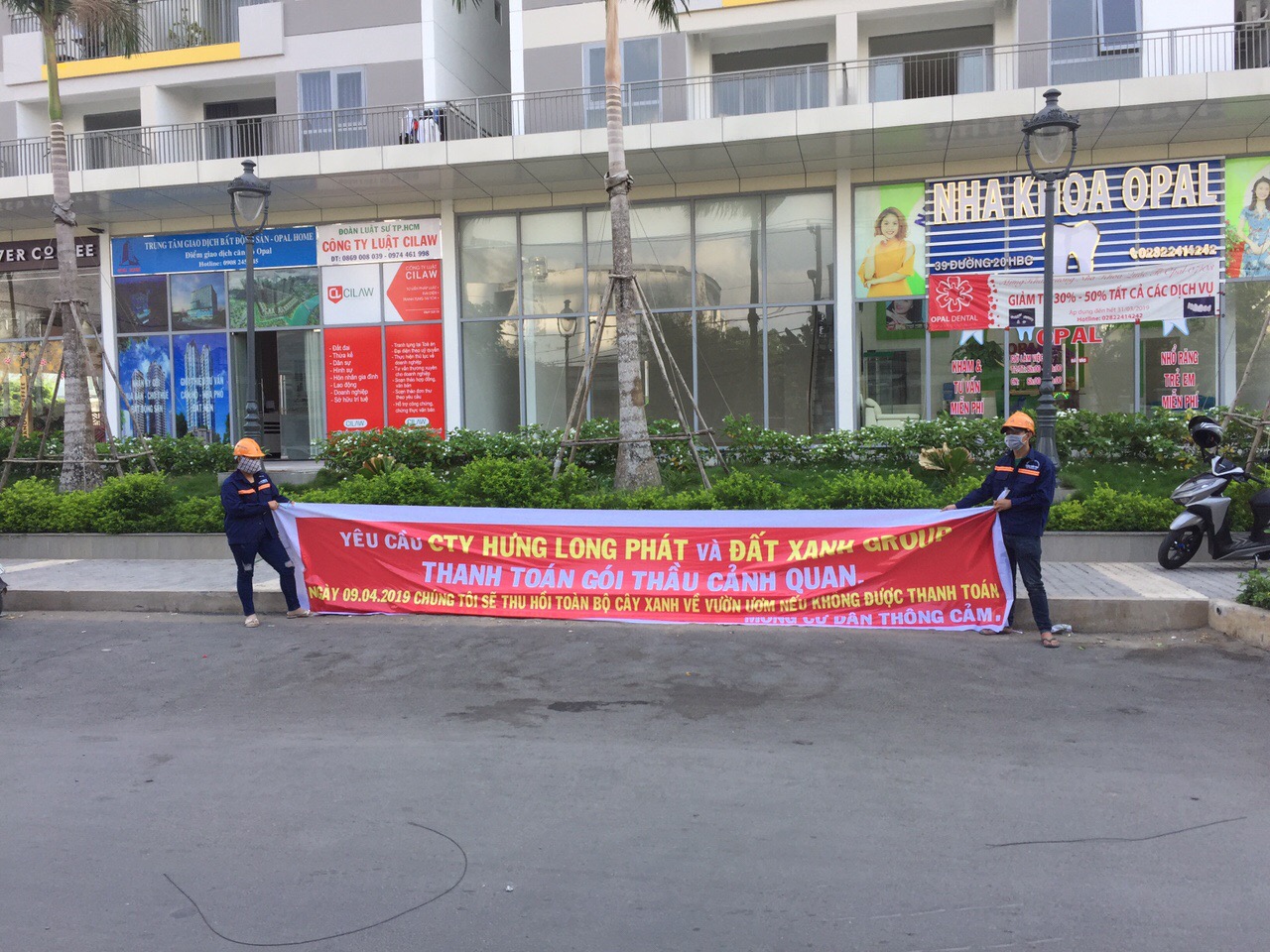 Theo anh Trương Minh Chánh, trưởng phòng quản lý dự án công ty Cường Tuấn Phát, thì công ty Cường Tuấn Phát là nhà thầu phụ có ký hợp đồng với công ty Hưng Lâm Phát là nhà thầu chính, tham gia thi công gói cây xanh cảnh quan tại dự án Opal Garden do tập đoàn Đất Xanh làm chủ đầu tư. Dự án đã hoàn thành, nghiệm thu và đưa vào sử dụng nhưng nhà thầu phụ mới chỉ nhận được 30% giá trị hợp đồng còn 70% còn lại vẫn chưa nhận được đồng nào.