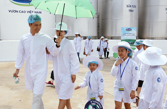 | Cả 4 thành viên gia đình diễn viên Mạnh Trường và các khách mời sữa học đường nhí hào hứng “check-in”siêu nhà máy sữa Vinamilk tại Bình Dương. |