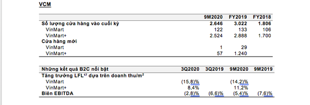 Tuy lượng khách hàng có giảm nhưng Doanh thu VinMart+ tăng 38,4% trong Quý III/2020 so với Quý III/2019 và tăng 56,5% trong 9 tháng đầu năm 2020 so với 9 tháng đầu năm 2019 dù đã đóng cửa 421 cửa hàng. Doanh thu của VinMart trong Quý III/2020 tăng 5,4% so với Quý II/2020 vì lượng khách đến siêu thị đã phục hồi. Tăng trưởng doanh thu/m2 đạt 8,3% so với quý trước, chủ yếu nhờ vào lượng khách tăng 9,3%.