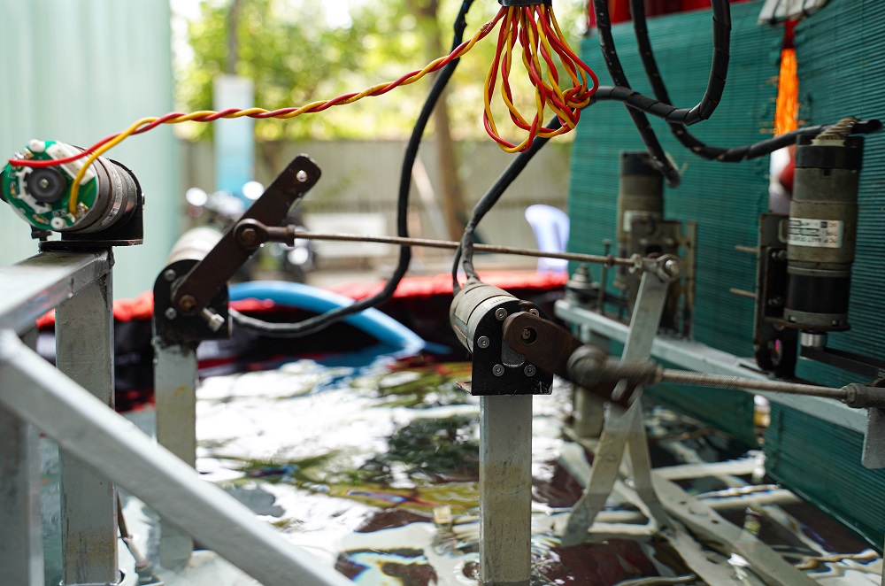 Để đảm bảo cho khả năng hoạt động lâu dài và nhiều lần, ngoài những khung inox, con rối thì động cơ và mạch điện của robot được lắp đặt phía trên mặt nước.