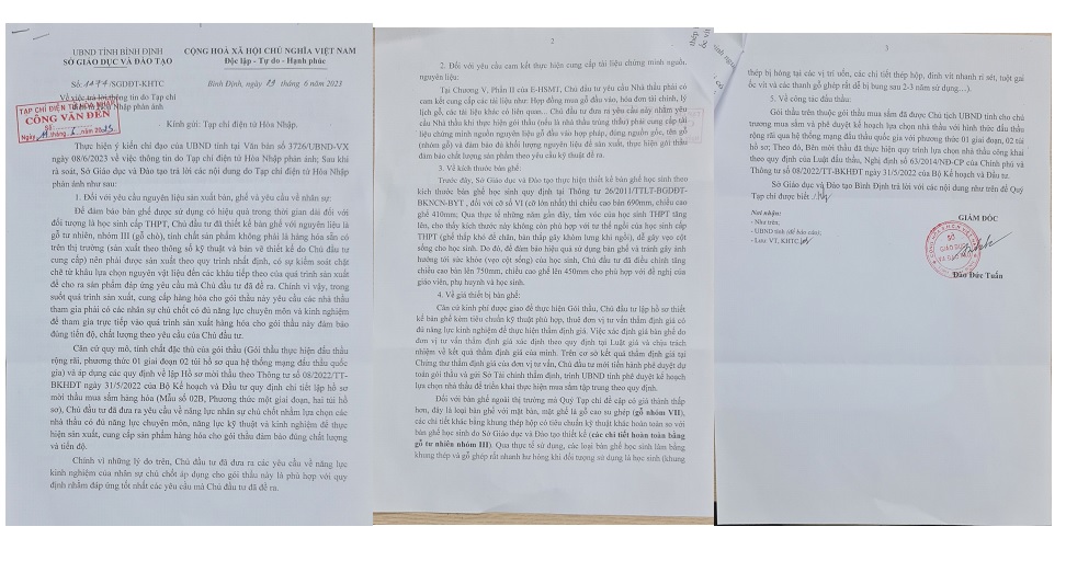 Trước đó, ngày 25/4/2023, Tạp chí điện tử Hòa nhập đã có công văn số 54/CV-HN kính chuyển tới Chủ tịch UBND tỉnh Bình Định phản ánh Sở GD&ĐT Bình Định đã xây dựng các tiêu chí đánh giá gói thầu theo hướng tìm một nhà máy sản xuất thiết bị bàn, ghế, thay vì tìm một nhà cung cấp. Theo đó, tại tiêu chuẩn đánh giá về kỹ thuật, nhà thầu phải đáp ứng đồng thời các điều kiện theo bản vẽ kỹ thuật của Chủ đầu tư, nguyên liệu làm bàn ghế theo dạng chỉ định: Nguyên liệu làm bàn là gỗ cao su tự nhiên, nguyên liệu làm ghế là gỗ chò. Điểm thể hiện rõ việc Sở GD&ĐT thể hiện việc tìm nhà sản xuất thiết bị khi xây dựng tiêu chuẩn kỹ thuật yêu cầu: Tay nghề cần thiết để sản xuất chế tạo hàng hoá: Chỉ huy trưởng/Kỹ thuật trưởng phải có 5 năm kinh nghiệm, tốt nghiệp đại học chuyên ngành thiết kế nội thất, có giấy chứng nhận bồi dưỡng chỉ huy trưởng; Cán bộ kỹ thuật 2 người, tốt nghiệp đại học chuyên ngành Công nghệ chế biến lâm sản; Công nhân kỹ thuật ≥ 15 người trở lên, có chứng nhận bậc 3/7 đối với các nghề (mộc dân dụng, mộc máy, mộc xây dựng, sơn PU).