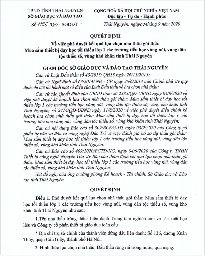 Cụ thể tại gói thầu: “Mua sắm thiết bị dạy học tối thiểu lớp 1 năm 2020”, Công ty Cổ phần Phú Bách Việt được phê duyệt trúng thầu với giá 3.500.739.000 đồng theo quyết định số 1325/QĐ-SGDĐT ngày 23/9/2020 do ông Phạm Việt Đức, giám đốc Sở Giáo dục và Đào tạo Thái Nguyên ký. Giá gói thầu 3.535.274.000 đồng.