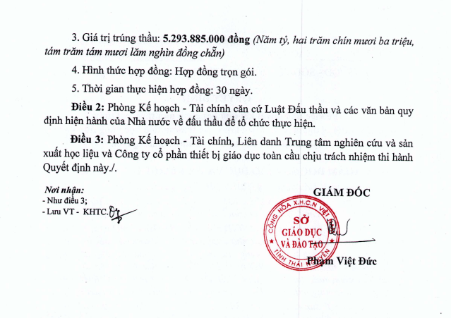 Quyết định phê duyệt lựa chọn kết quả nhà thầu do ông Phạm Việt Đức, giám đốc Sở GD&ĐT Thái Nguyên ký