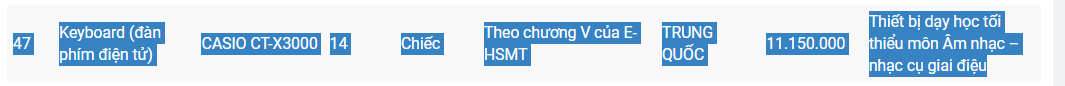 Cụ thể như Keyboard (đàn phím điện tử) CASIO CT-X3000, xuất xứ Trung Quốc được Sở Giáo dục và Đào tạo Thái Nguyên duyệt mua với giá 11.150.000 đồng/cái (mua 14 cái). Trên thị trường, sản phẩm này có giá bán phổ biến dưới 8 triệu đồng/cái (đã bao gồm VAT, phí vận chuyển).