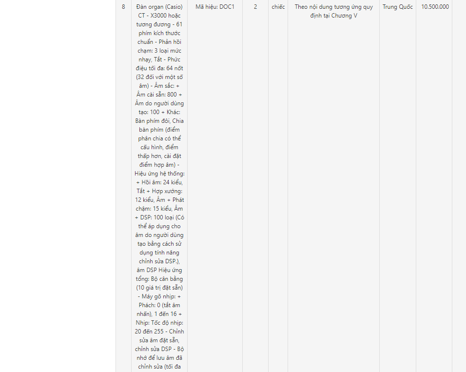 Trong khi đó, ở gói thầu cũng diễn ra năm 2020, Ban quản lý dự án đầu tư xây dựng huyện Sóc Sơn (Hà Nội) mua sản phẩm Keyboard (đàn phím điện tử) CASIO CT-X3000, xuất xứ Trung Quốc với giá thấp hơn đáng kể, chỉ 10.500.000 đồng/cái.