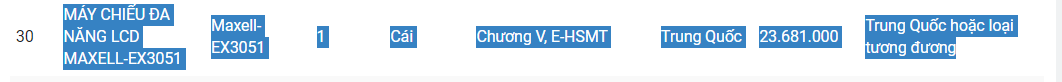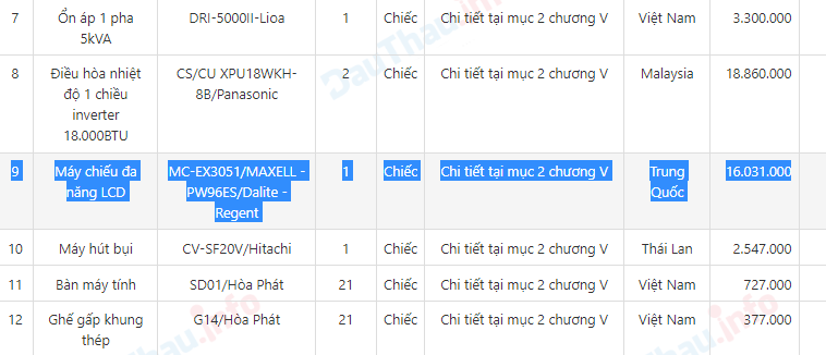 Theo đó máy chiếu đa năng LCD Maxell - EX3051 xuất xứ Trung Quốc được Sở Giáo dục và Đào tạo Thái Nguyên duyệt mua với giá 23.681.000 đồng/cái. Tuy nhiên sản phẩm này trên thị trường có giá bán thấp hơn vài triệu đồng, cụ thể chỉ gần 21 triệu đồng/cái (đã bao gồm VAT, phí vận chuyển).