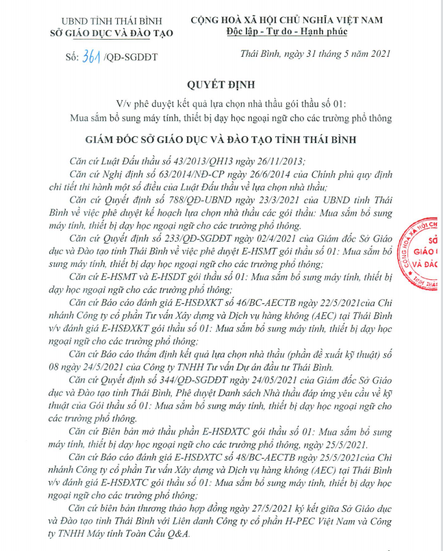 Tháng 5/2021 Công ty cổ phần H-PEC Việt Nam được phê duyệt trúng gói thầu: Mua sắm bố sung máy tính, thiết bị dạy học ngoại ngữ cho các trường phổ thông, được phê duyệt trúng thầu với giá 17.229.530.000 đồng theo quyết định số 361/QĐ-SGDĐT ngày 31/5/2021 do ông Nguyễn Viết Hiển, giám đốc Sở Giáo dục và Đào tạo tỉnh Thái Bình ký. Giá gói thầu 17.318.322.000 đồng. Tiết kiệm ngân sách 90 triệu đồng, tức chỉ là 0,51/%.