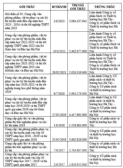Từ năm từ 2017 đến 2023 Sở Giáo dục và Đào tạo Hà Nội (Sở GD&ĐT Hà Nội) có các gói thầu Cung cấp văn phòng phẩm, vật tư phục vụ các kỳ thi tuyển sinh đầu cấp và thi tốt nghiệp với tổng giá trị hàng chục tỷ đồng đều do Công ty cổ phần sách và thiết bị trường học Hà Nội và Công ty cổ phần sách và thiết bị trường học Hà Tây thay nhau trúng thầu hoặc dắt tay nhau trúng thầu.