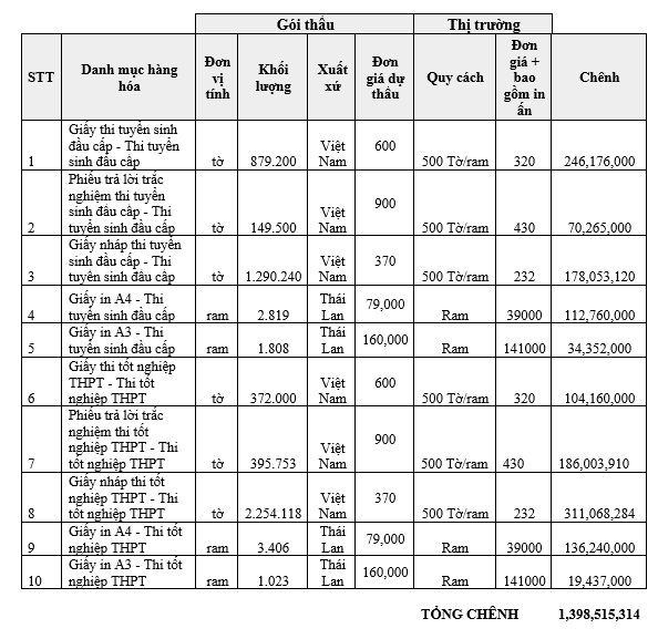 Cũng theo phản ánh, giá các vật tư trong gói thầu có phần cao hơn thị trường, đơn cử, gói thầu Cung cấp văn phòng phẩm, vật tư phục vụ các kỳ thi tuyển sinh đầu cấp năm học 2023 - 2024 và thi tốt nghiệp THPT năm 2023 đối với danh mục hàng hóa Giấy thi tuyển sinh đầu cấp - Thi tuyển sinh đầu cấp, theo yêu cầu được đưa ra là “Giấy Bãi Bằng hoặc tương đương, Khổ 297 mm x 420mm, Định lượng 70gsm, Độ trắng 90% ISO. In 2 mặt theo mẫu”. Yêu cầu kỹ thuật đưa ra trên có dấu hiệu đưa tiêu chí hạn chế nhà thầu khi nói cụ thể một nhãn hiệu, một thương hiệu giấy cụ thể.