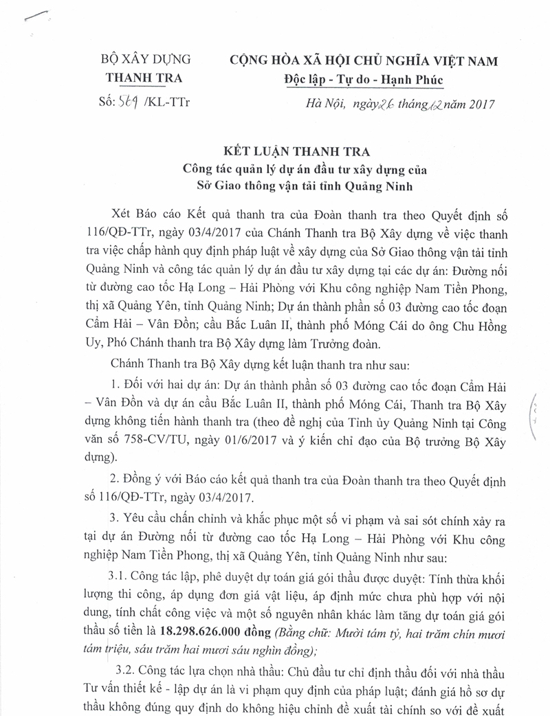 Xét Báo cáo Kết quả thanh tra của Đoàn thanh tra theo Quyết định số 116/QĐ-TTr, ngày 03/4/2017 của Chánh Thanh tra Bộ Xây dựng về việc thanh tra việc chấp hành quy định pháp luật về xây dựng của Sở Giao thông vận tải tỉnh Quảng Ninh và công tác quản lý dự án đầu tư xây dựng tại các dự án: Đường nối từ đường cao tốc Hạ Long - Hải Phòng với Khu công nghiệp Nam Tiền Phong, thị xã Quảng Yên, tỉnh Quảng Ninh; Dự án thành phần số 03 đường cao tốc đoạn Cẩm Hải - Vân Đồn; cầu Bắc Luân II, thành phố Móng Cái do ông Chu Hồng Uy, Phó Chánh thanh tra Bộ Xây dựng làm Trường đoàn.