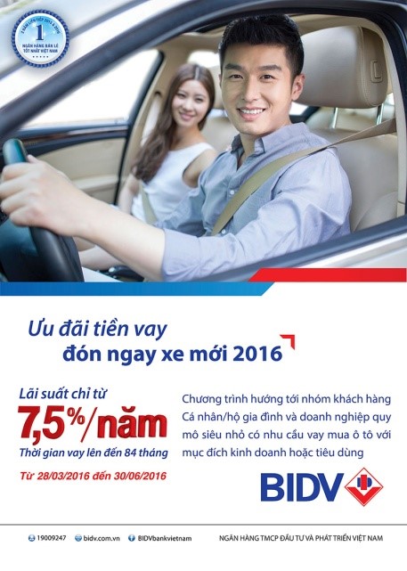 HOANHAP.VN - Nhằm hỗ trợ tích cực nhu cầu vay mua ô tô của khách hàng cá nhân từ 28/03/2016 đến 30/06/2016, Ngân hàng TMCP Đầu tư và Phát triển Việt Nam - BIDV triển khai Chương trình “Ưu đãi tiền vay, đón ngay xe mới 2016” với nhiều ưu đãi hấp dẫn.