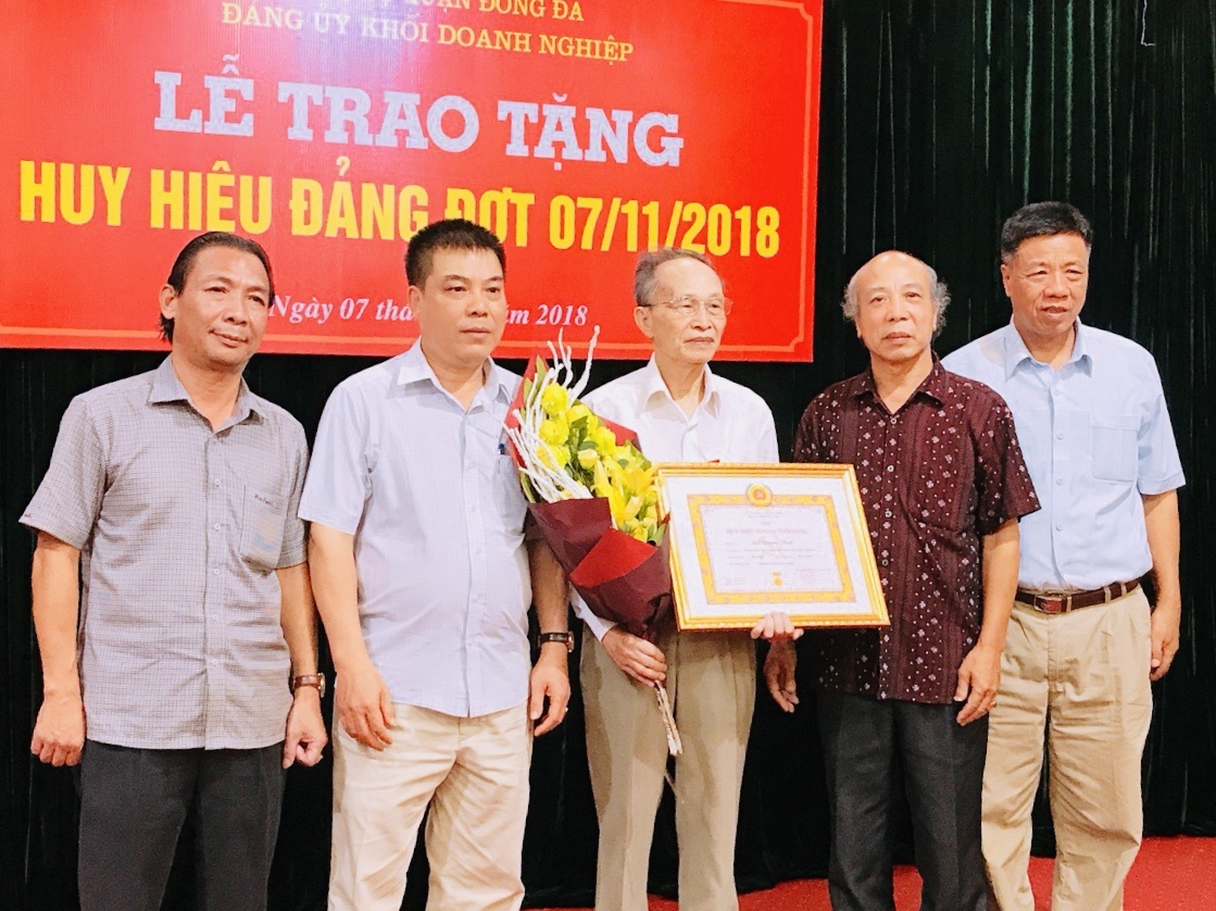 | Đồng chí Nguyễn Trọng Hồng - Bí thư Đảng ủy khối Doanh nghiệp Quận Đống Đa trao tặng Huy hiệu Đảng cho các Đảng viên trong khối. |