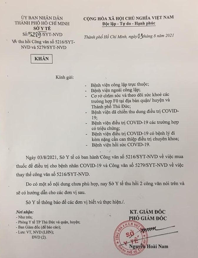 Như vậy trong ngày 3-8 Sở Y tế TP.HCM ban hành 3 văn bản: (1): Văn bản số 5216 về việc "mua thuốc điều trị cho bệnh nhân mắc COVID-19". (2): Văn bản số 5279 về việc "thay thế văn bản 5216". (3): Văn bản số 5289 về việc "thu hồi văn bản 5216 và 5279".