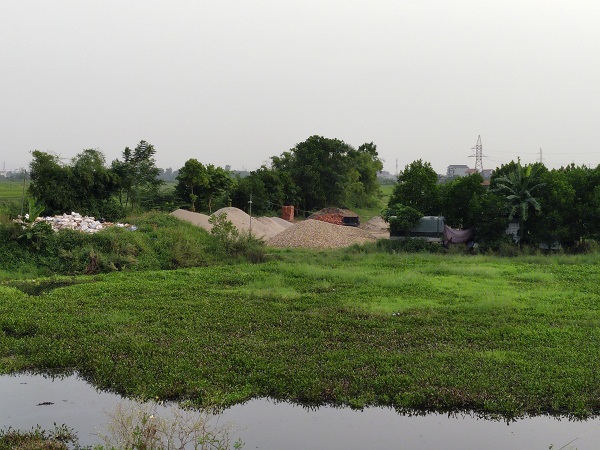 Theo ghi nhận của PV, bãi tập kết vật liệu xây dựng nằm ở đầu thôn Thu Thủy, xã Xuân Thu (Sóc Sơn, Hà Nội) nằm sát đầm, gần đê Lương Phúc.