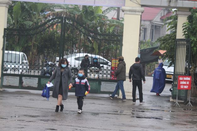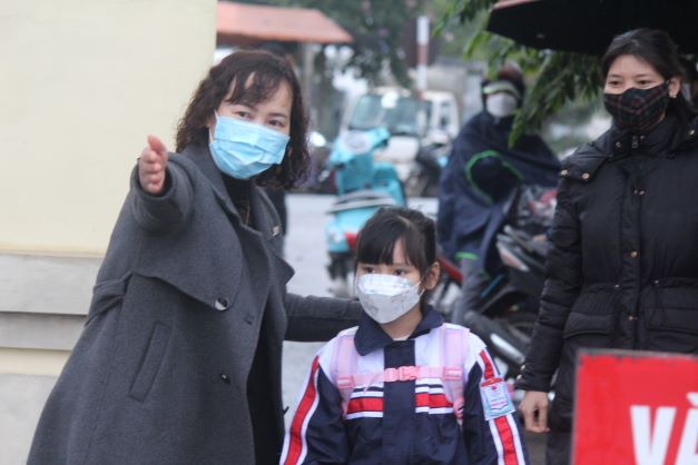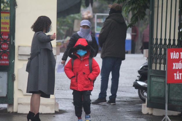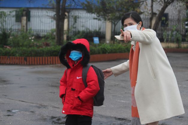 Các em học sinh được người thân đưa đến Trường tiểu học Trung Giã B từ sáng sớm dưới cái rét cắt da cắt thịt 11 độ C tại Hà Nội.