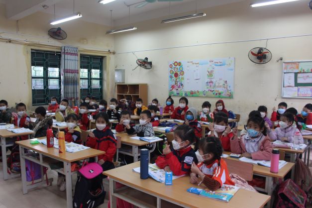Học sinh Trường Tiểu học Trung Giã B (xã Trung Giã, huyện Sóc Sơn, Hà Nội) ngày trong buổi học đầu tiên. Các em khá phấn khởi, vui mừng sau kỳ nghỉ dịch dài