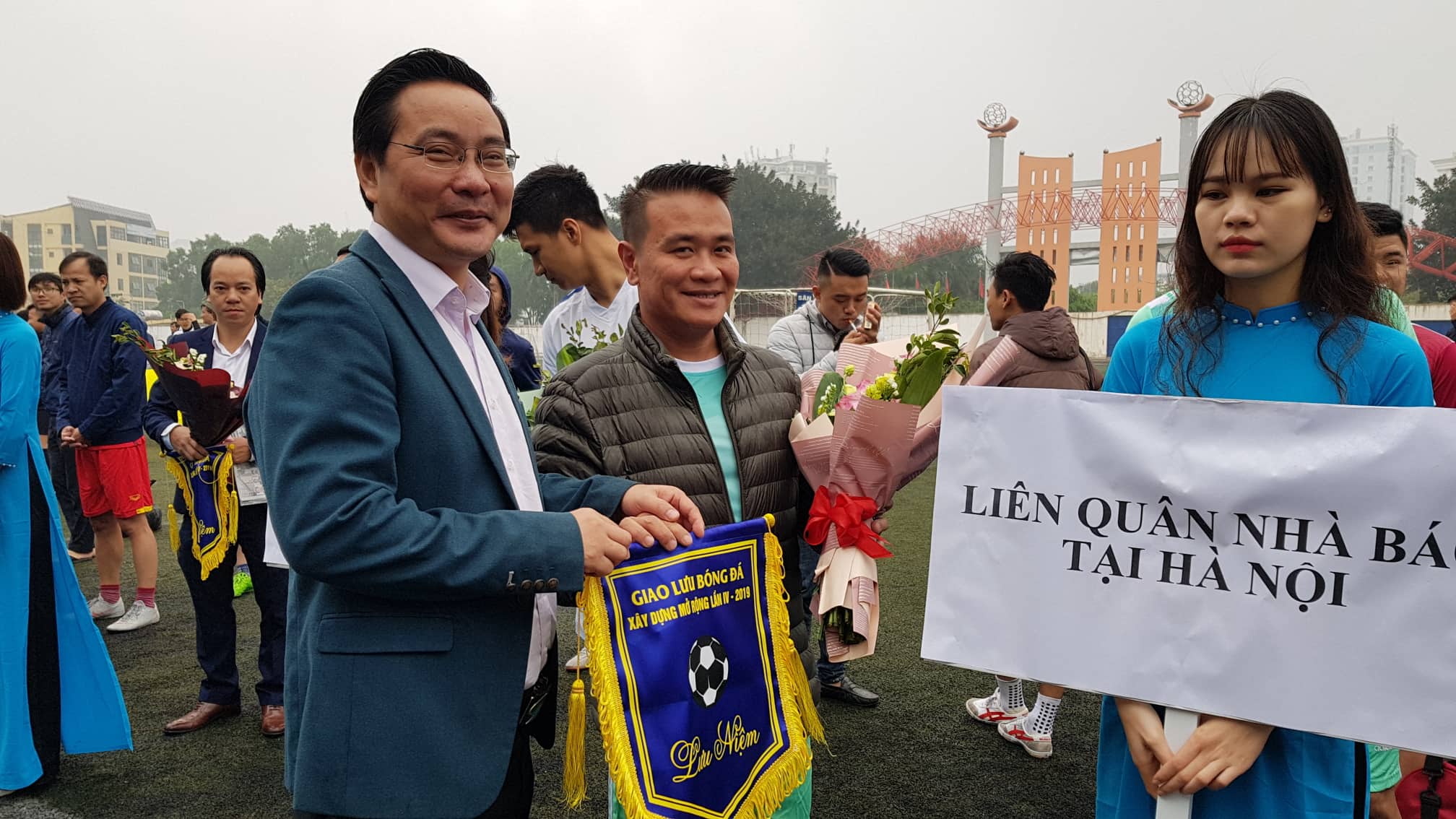 Ông Nguyễn Ngọc Quyết - Tổng Biên tập Tạp chí Hướng nghiệp và Hòa nhập tặng hoa Liên quân Nhà báo tại Hà Nội và chúc đội bóng thành công trong mùa giải