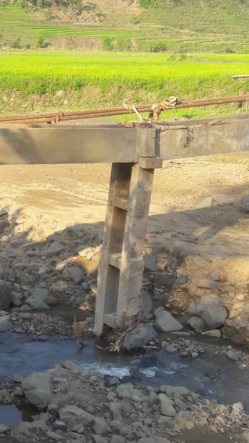 Anh Khương cho biết: qua mấy năm, cứ lâu lâu lại thấy làm. Đơn vị thi công ở đây là Công ty Hồng Long, đóng trên địa bàn huyện Phù Yên. Ở đây có 2 đường nước để dẫn tưới tiêu cho các cánh đồng của xã Gia Phù và phía dưới nữa. Đó là đường nước của hệ thống tưới tiêu, họ đổ bê tông như hình “bao diêm”, cứ thế chạy dài qua các khu đồng. Phía bên cánh đồng gần nhà anh Khương thì có nước chảy bập bõm, nhưng giờ nứt rồi thì chả còn “mơ nước” nữa. Một đường ống máng nước nữa phía bên đồi kia thì nước chảy tắc bụp, chỉ 1 đoạn có nước, còn không thì chỉ có nước trong “mơ”. Đây gọi là hệ thống nước tưới tiêu. Còn hệ thống nước sinh hoạt thì dẫn bằng ống sắt. Có 2 đường ống sắt, 1 to, 1 nhỏ là đường nước tự chảy, mục đích là để dùng cho sinh hoạt. Nước ở khu vực xã Suối Bau, chảy xuống 1 bể lọc xây, rồi tự chảy xuống. Đường ống to thì chả bao giờ chảy, còn ống bé thì nước nhỏ giọt. Nhiều lần nhân dân kiến nghị, nhưng chả thấy ai đoái hoài đến.