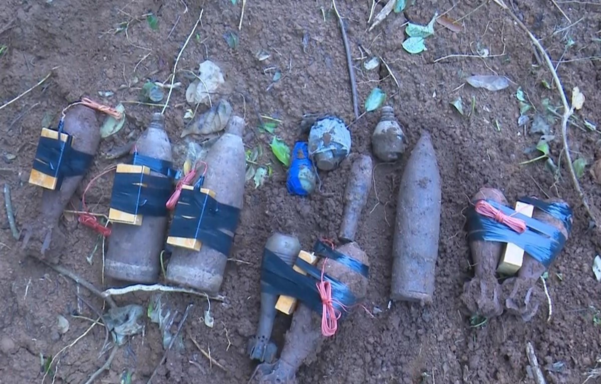| Số bom, mìn, vật liệu nổ còn sót lại sau chiến tranh ra phá được tại di tích Đồn Mộc Lỵ, thị trấn Mộc Châu, huyện Mộc Châu, tỉnh Sơn La. (Ảnh: TTXVN phát) |