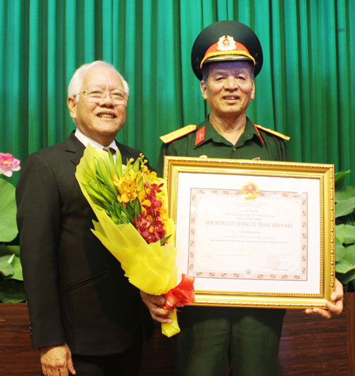 | Chủ tịch UBND TP.HCM Lê Hoàng Quân và ông Vũ Đình Bạch trong ngày ông Bạch nhận danh hiệu AHLLVTND |