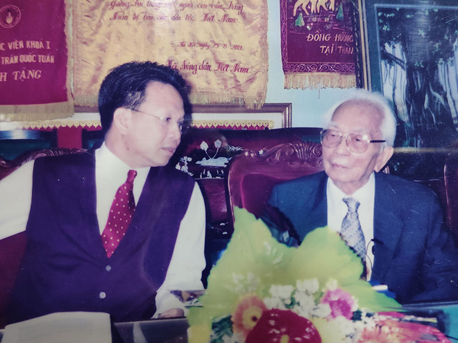 | Ông Phạm Đức Trung Kiên trình bày các dự án giáo dục tâm huyết với Đại tướng Võ Nguyên Giáp (khoảng năm 2009 - 2010). Ảnh: Nhân vật cung cấp |