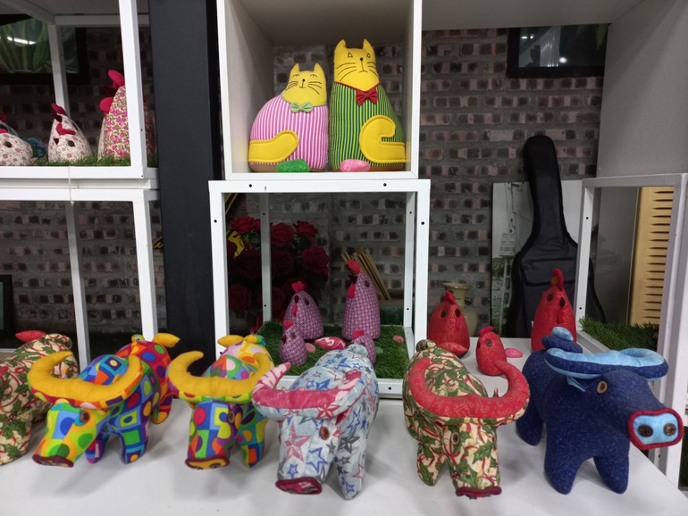 Ngoài ra, xưởng còn sản xuất cả túi xách, gối tựa lưng, gối kê cổ. Nhìn những con thú, những chiếc túi xách, gối tựa tinh xảo, đẹp mắt, khó có thể nghĩ rằng đó là sản phẩm do những người câm điếc làm ra tại gian xưởng thủ công nhỏ.