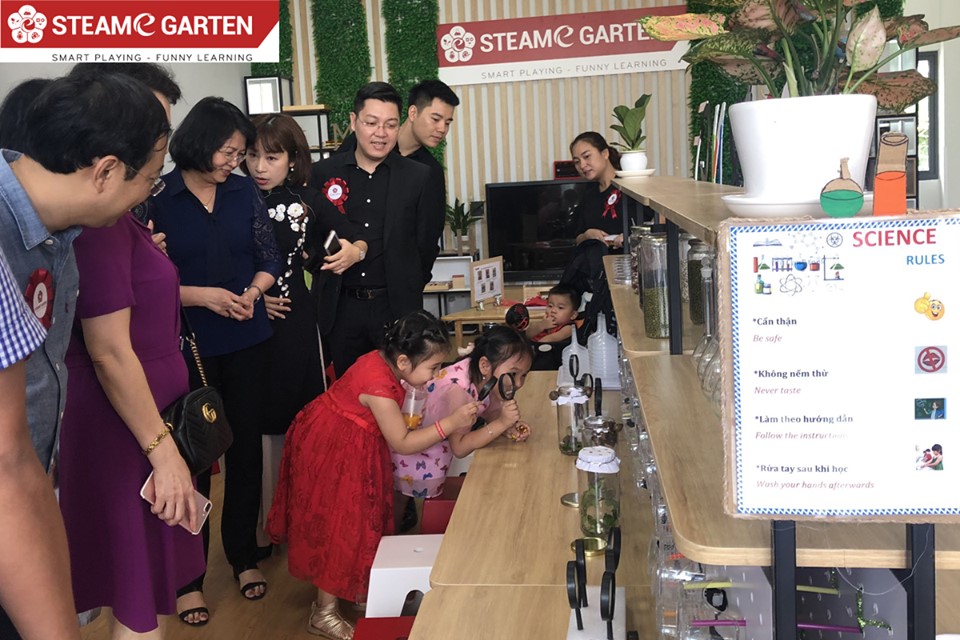 STEAMe GARTEN là hệ thống trường Mầm non Song ngữ đầu tiên ứng dụng bài bản phương pháp giáo dục STEAM tại Việt Nam. Mô hình STEAM là sự kết hợp giữa STEM và Art (Nghệ thuật sáng tạo). STEM là phương pháp giáo dục tích hợp các yếu tố về Science (Khoa học), Technology (Công nghệ), Engineering (Kỹ thuật) và Math (Toán học). Giúp trẻ hiểu biết rõ về các nguyên lý, dễ dàng nắm bắt được lý thuyết và thực hành.