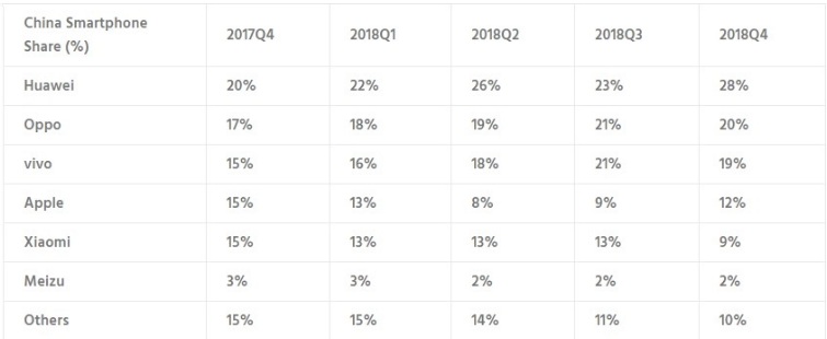 Theo số liệu từ counterpointresearch, thị phần điện thoại của Huawei liên tục tăng, báo cáo Q4 2018 công ty chiếm tới 28% thị phần của đất nước tỷ dân. Và nếu các bạn cập nhật thông tin liên tục thì sẽ biết người dân Trung Quốc đã bắt đầu làn sóng tẩy chay Apple, và nếu số người đang dùng Apple đổi qua những mẫu Huawei cao cấp có thể bù đắp được phần nào thị phần mất đi ở các nước ngoài Trung Quốc.