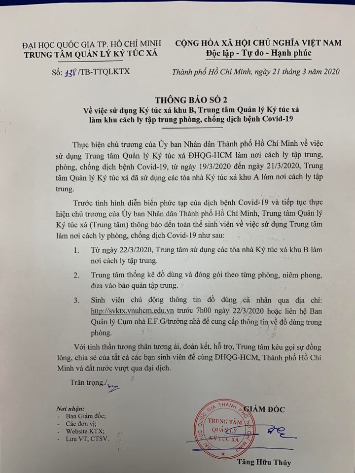 Ngày 21/3, Trung tâm Quản lý KTX – Đại học Quốc gia TP.HCM đã có thông báo số 138/TB-TTQLKTX về việc sử dụng KTX Khu B, Trung tâm Quản lý Ký túc xá làm khu cách ly tập trung phòng, chống dịch Covid-19.
